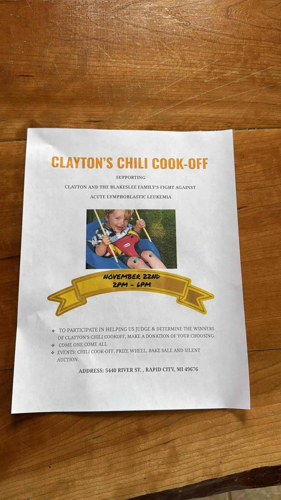 Come support a family in need! Clayton is 3 years old and was just diagnosed with Leukemia. There will be a chili cook off fundraiser to help the family, by donation. There will be a bake sale
